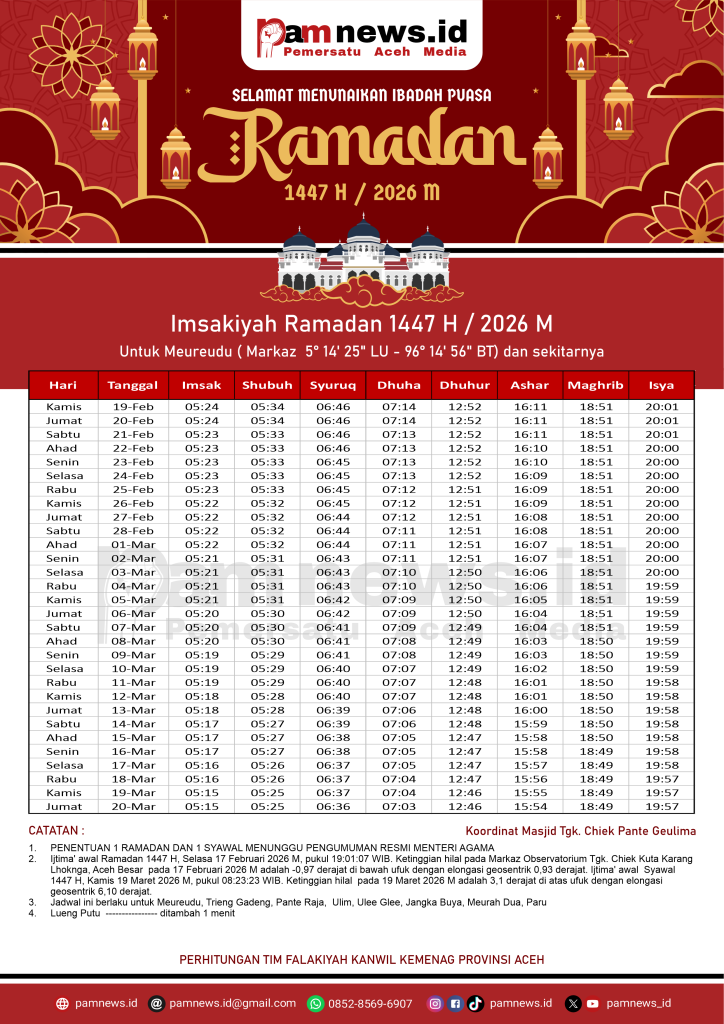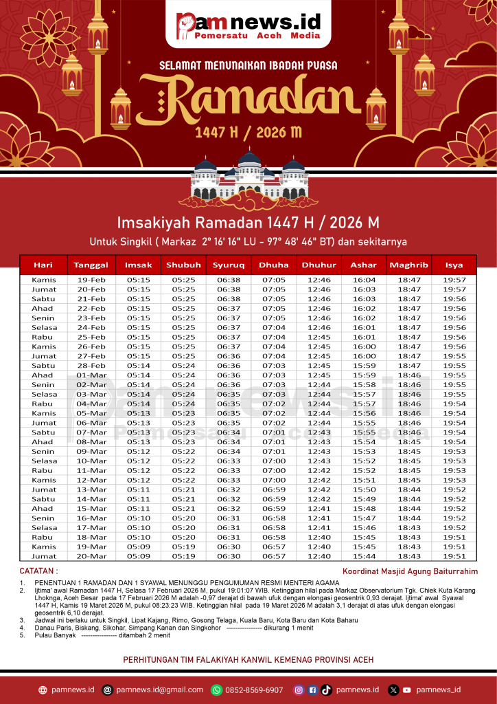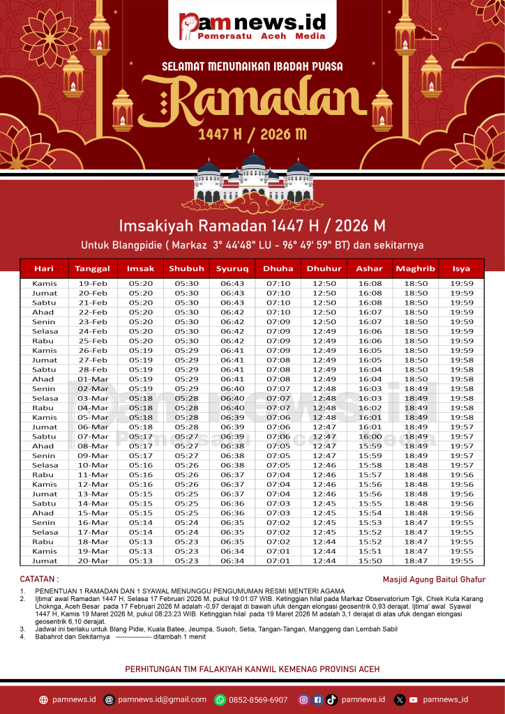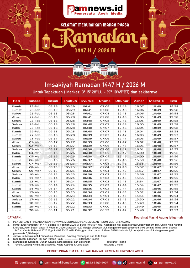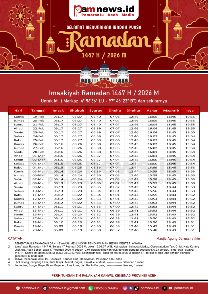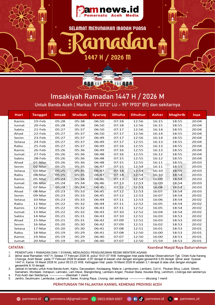PAMNEWS.ID, BANDA ACEH – Dalam rangka menyambut Ramadan 1447 H / 2026 M, kami menyediakan Jadwal Imsakiyah Ramadan 1447 H / 2026 M untuk seluruh kabupaten/kota di Aceh.