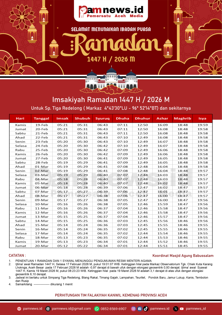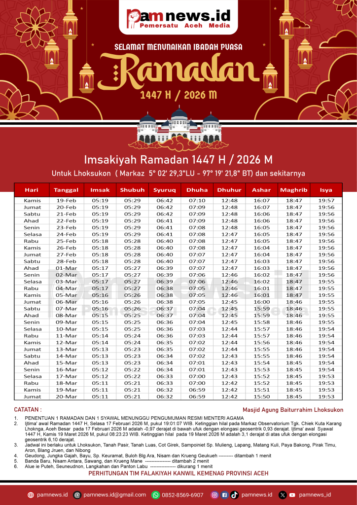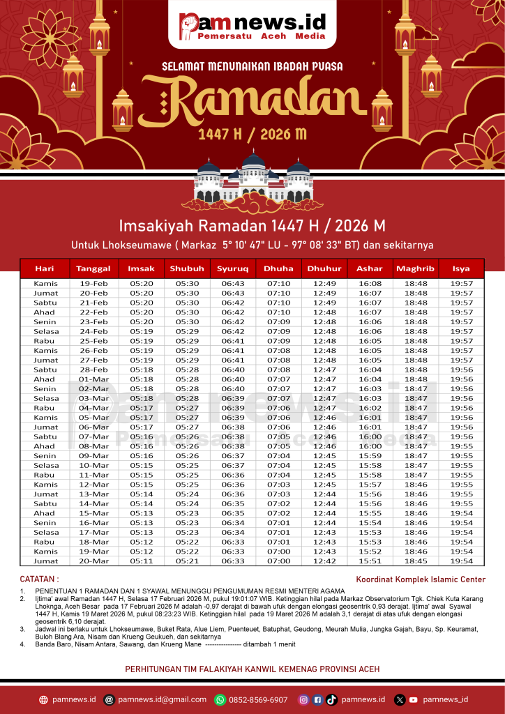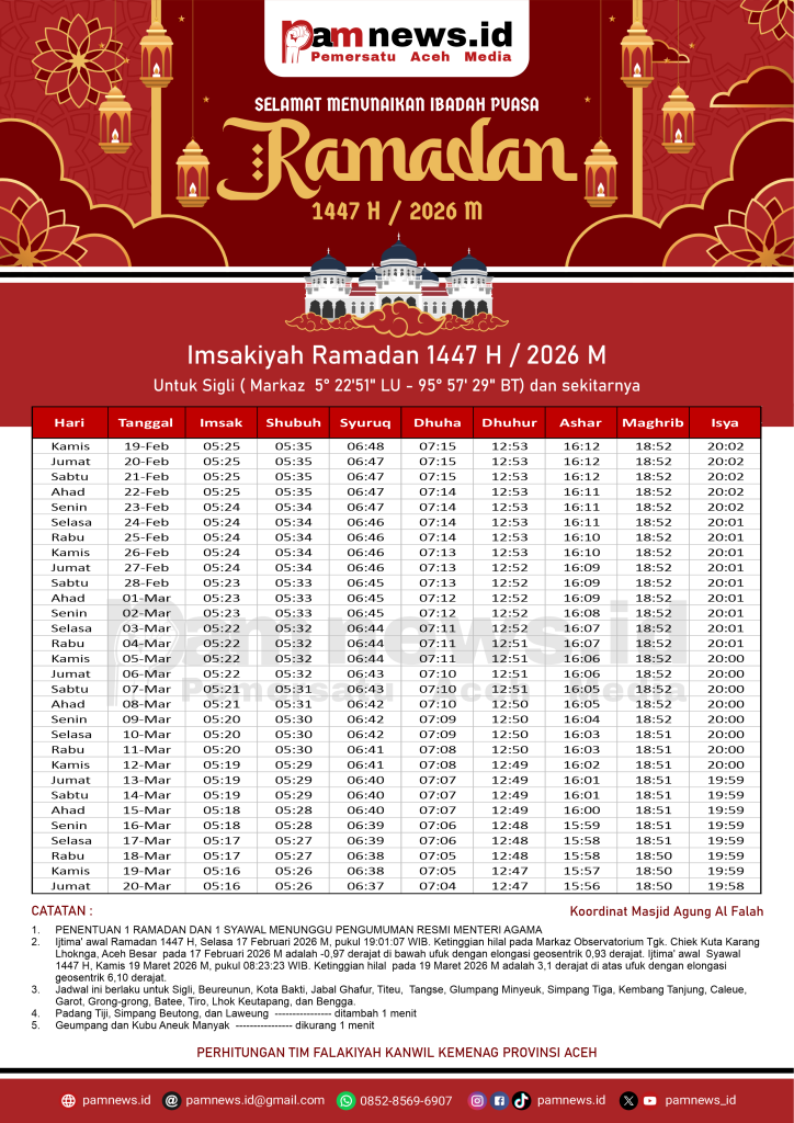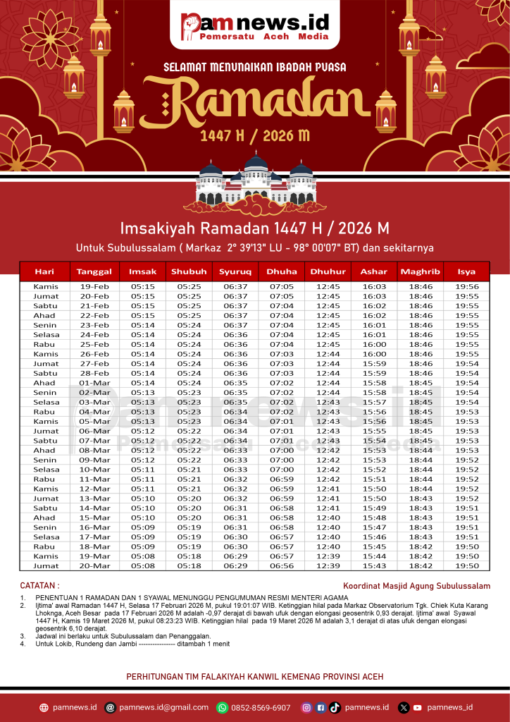 PAMNEWS.ID, BANDA ACEH – Dalam rangka menyambut Ramadan 1447 H / 2026 M, kami menyediakan Jadwal Imsakiyah Ramadan 1447 H / 2026 M untuk seluruh kabupaten/kota di Aceh.