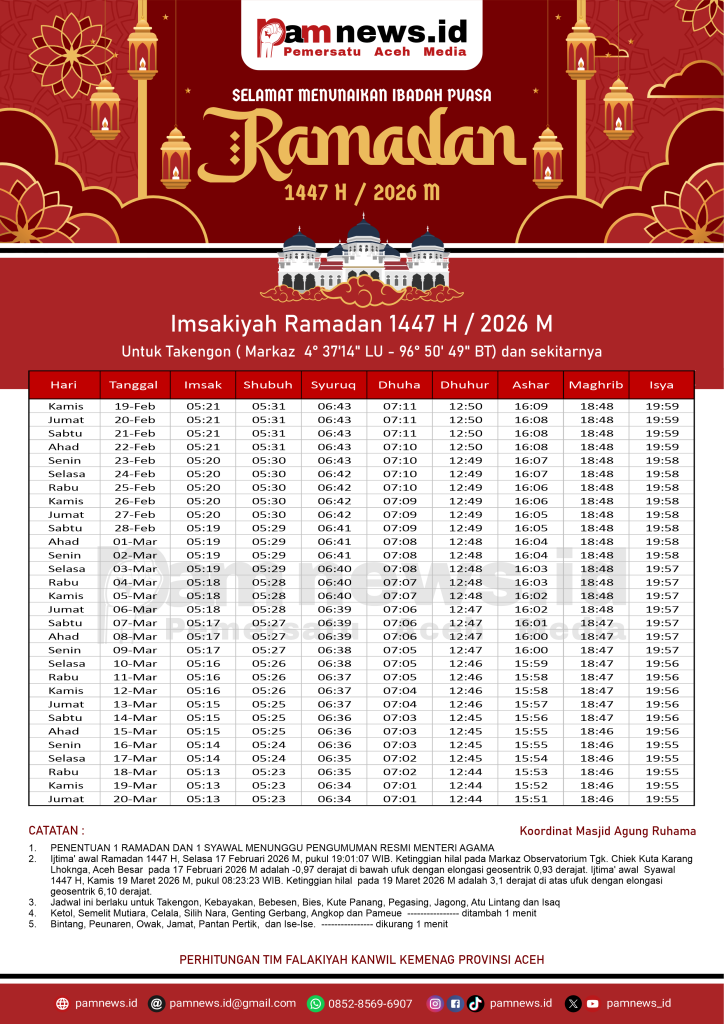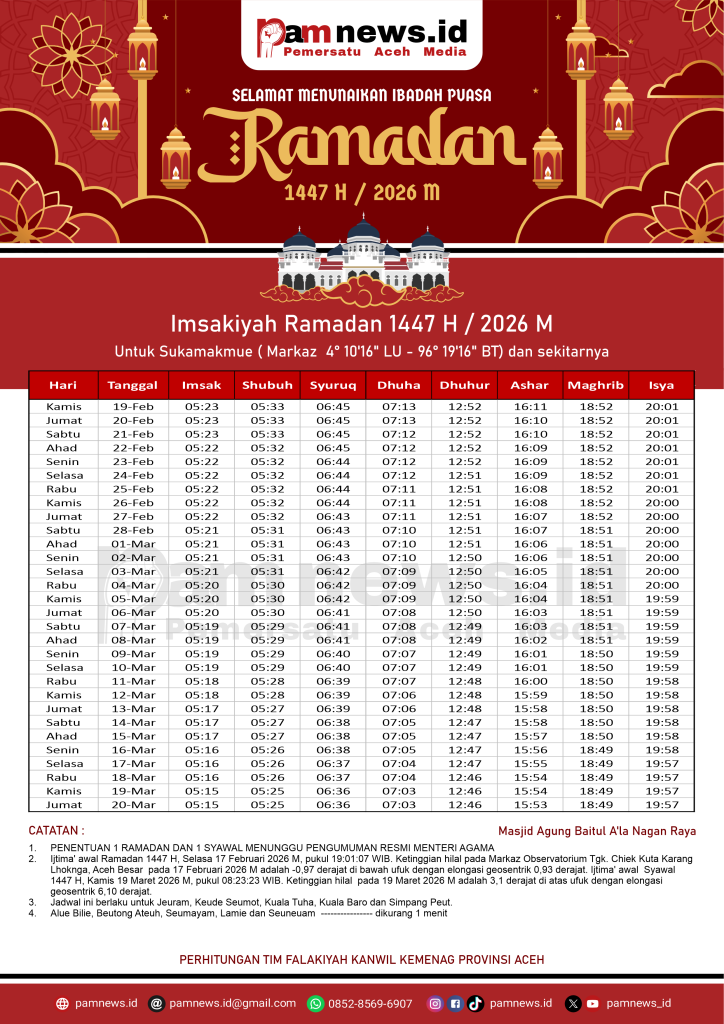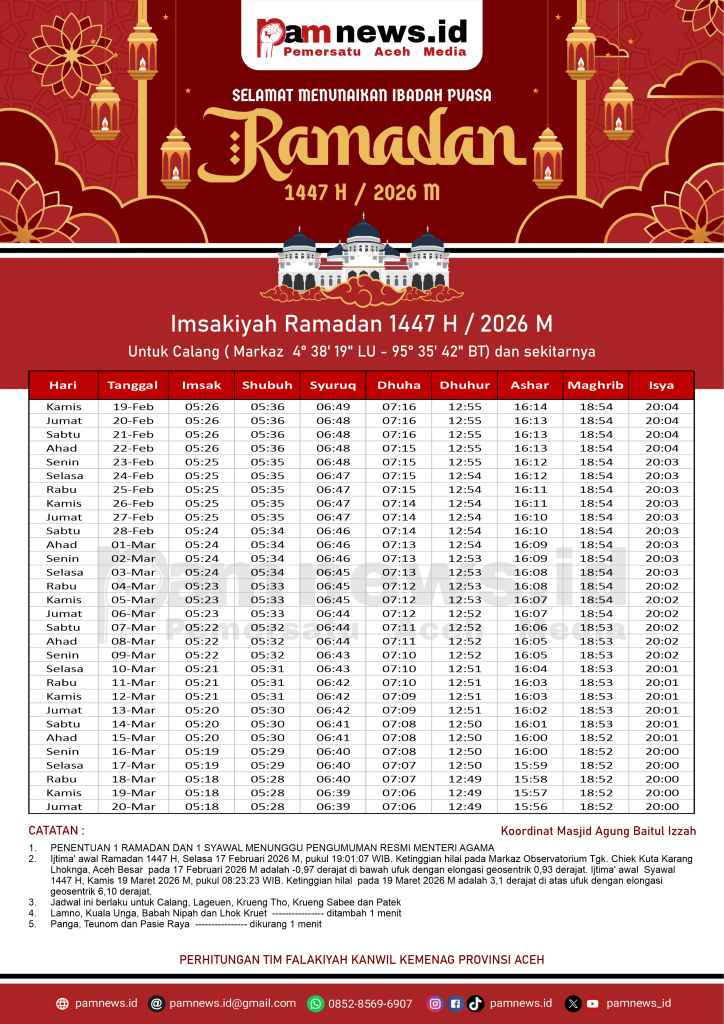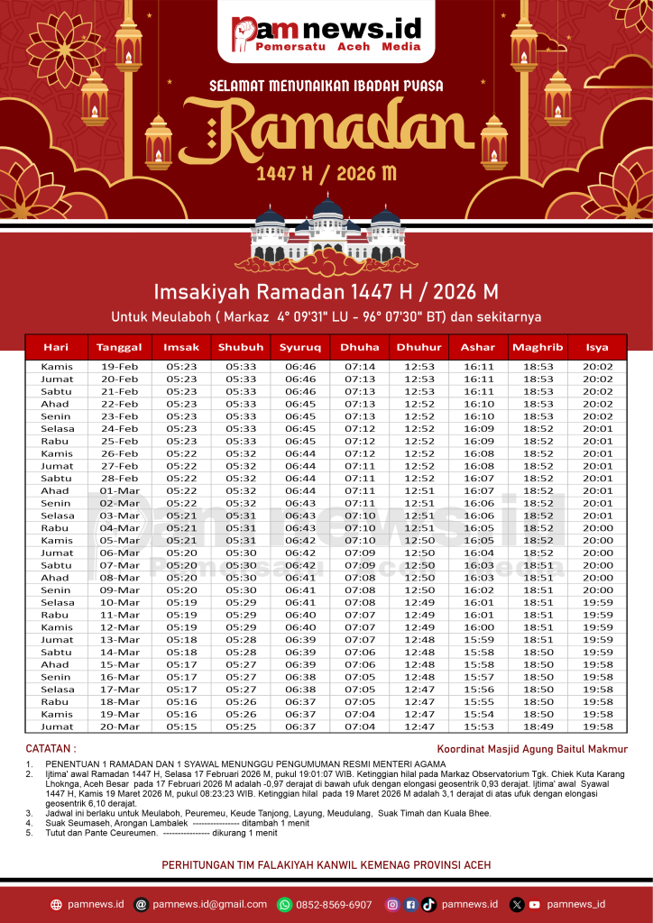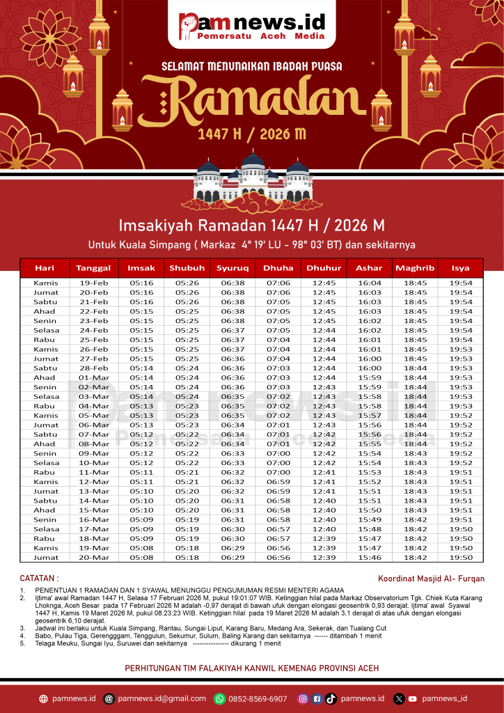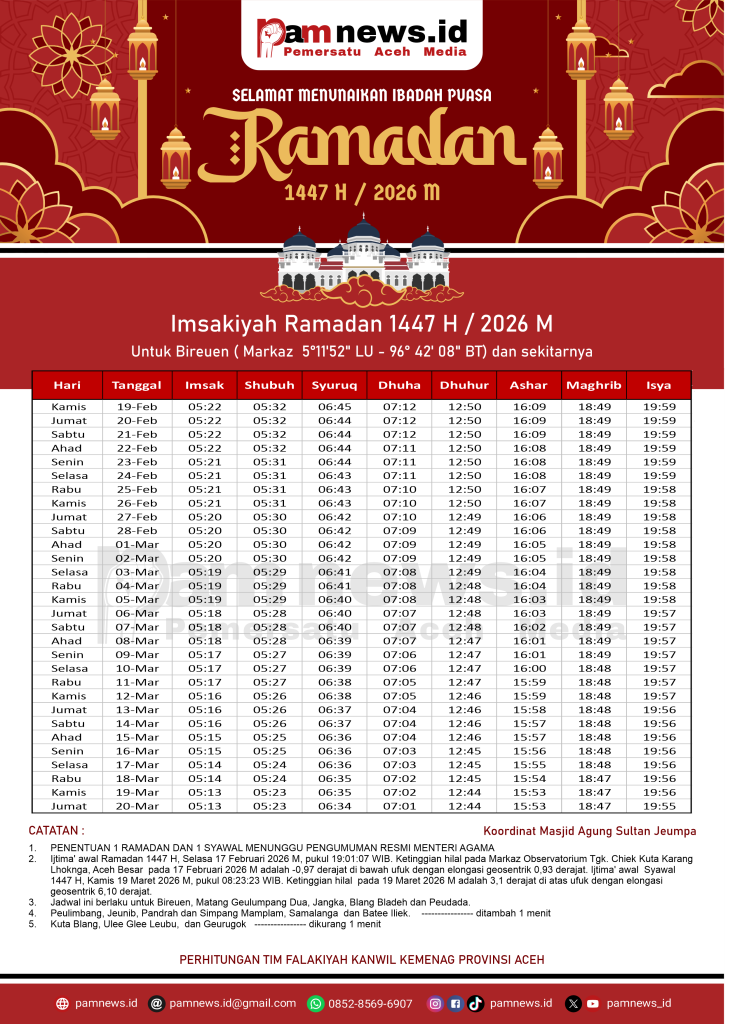 PAMNEWS.ID, BANDA ACEH – Dalam rangka menyambut Ramadan 1447 H / 2026 M, kami menyediakan Jadwal Imsakiyah Ramadan 1447 H / 2026 M untuk seluruh kabupaten/kota di Aceh.
