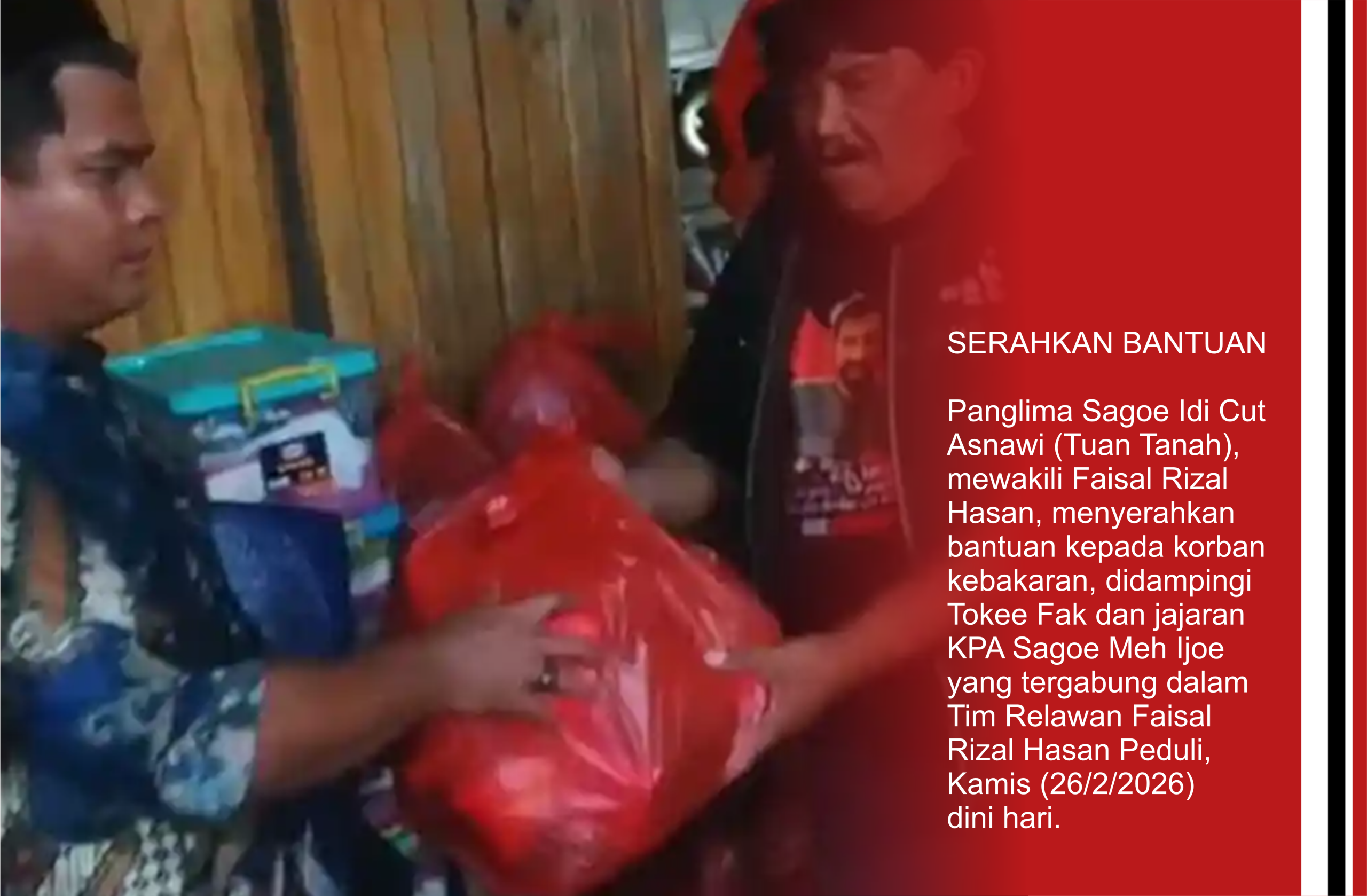 Mewakili Faisal Rizal Hasan, bantuan diserahkan langsung oleh Panglima Sagoe Idi Cut Asnawi (Tuan Tanah), didampingi Toke Fak bersama jajaran KPA Sagoe Meh Ijoe yang tergabung dalam Tim Relawan Faisal Rizal Hasan Peduli.