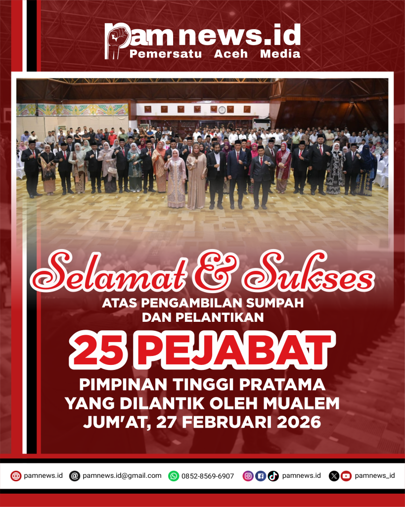 PAMNEWS.ID, BANDA ACEH – Gubernur Aceh, Muzakir Manaf yang akrab disapa Mualem, melantik dan mengambil sumpah sejumlah Pejabat Pimpinan Tinggi Pratama (Eselon II) di lingkungan Pemerintah Aceh. Prosesi pelantikan berlangsung di Anjong Mon Mata, Jumat malam (27/2/2026).